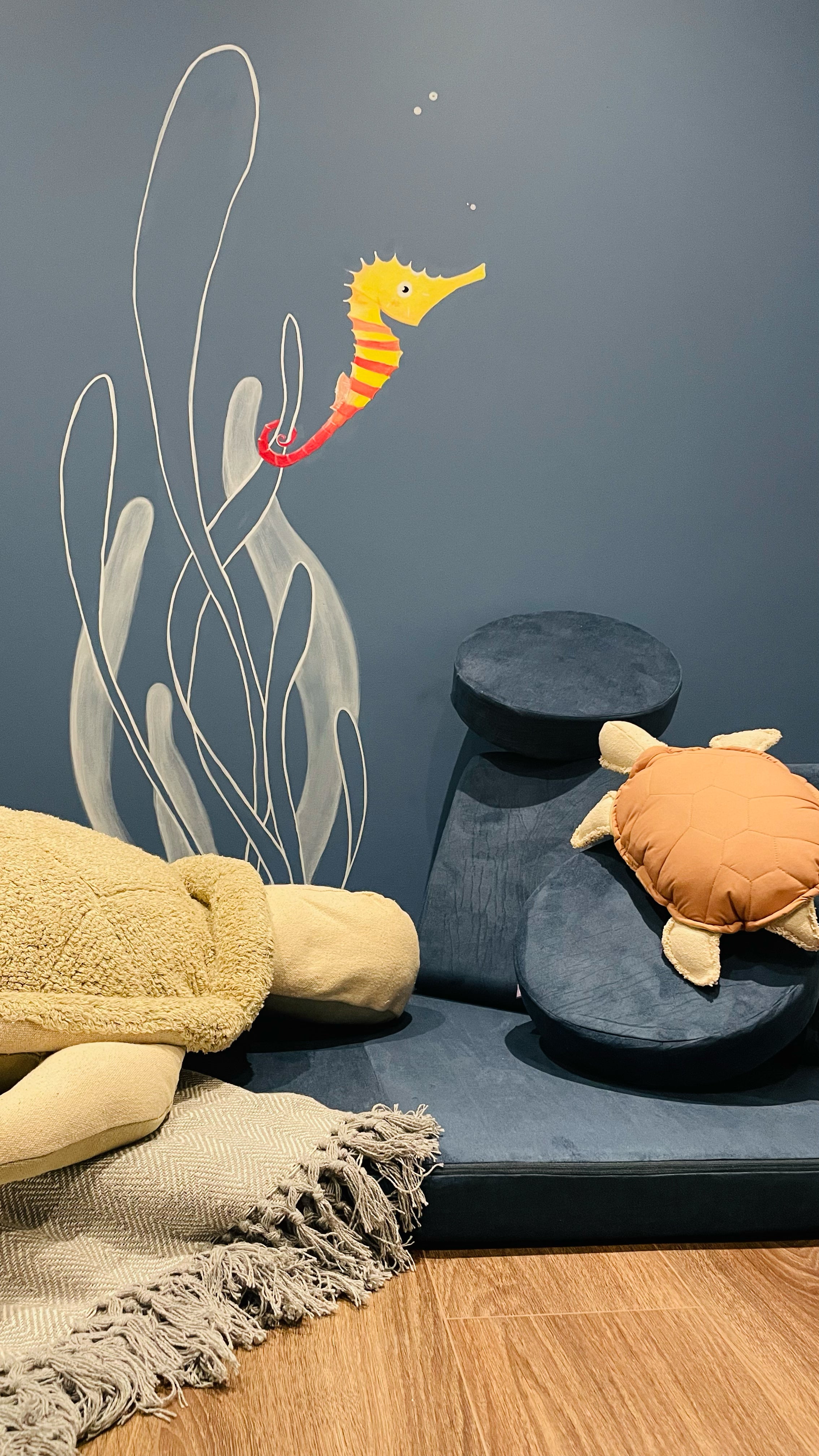 Besonders beeindruckend sind die handgemalten Wandbilder von Kio, dem kleinen Seepferdchen, die die Räume nicht nur dekorieren, sondern Leben und Geschichte vermitteln. Mit viel Liebe zum Detail gestaltet, werden sie zu einem echten Highlight – für Kinder wie Erwachsene gleichermaßen.